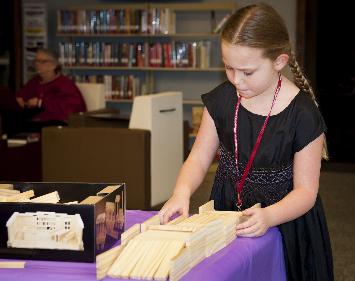 Eglin community homeschooled children build a bridge using ice pop sticks and tape at the Science, Technology, Engineering and Mathematics event Jan. 11 at the Digital Library at Eglin Air Force Base, Fla. The children learned fun facts about bridges, then divided into teams and constructed bridges using sticks, plastic building blocks and wooden blocks. (U.S. Air Force photo/Kevin Gaddie)