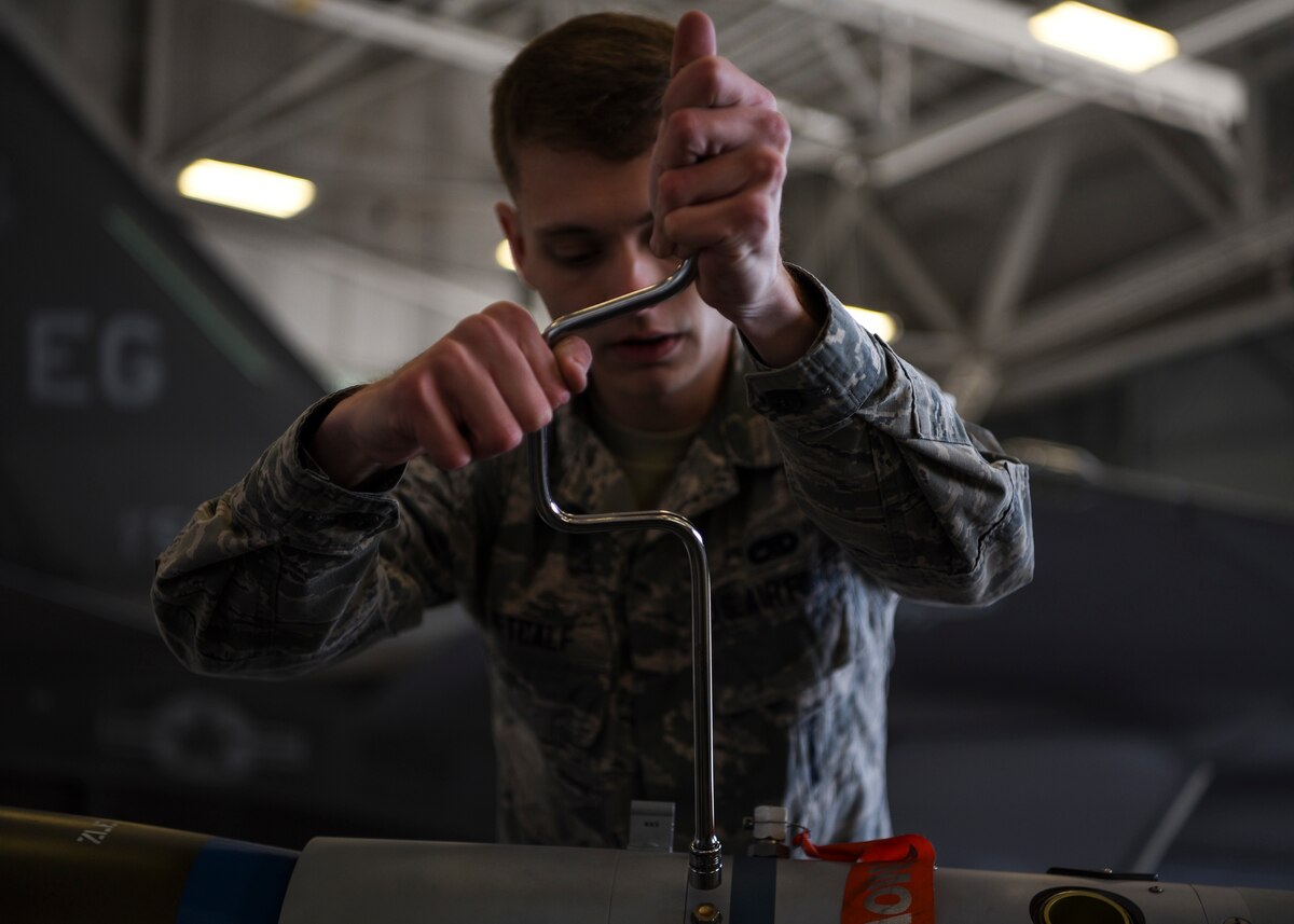 U.S. Air Force Senior Airman Michael Ridgeway, 33rd Fighter Wing weapons load crew member, lifts a GBU-31 with a jammer March 23, 2018, at Eglin Air Force Base, Fla. The 33rd Fighter Wing hosts quarterly weapons load competitions where the top crews display their skills in a timed and graded contest. The participants are evaluated on safety and how closely they follow joint technical data. (U.S. Air Force photo by Airman 1st Class Emily Smallwood)