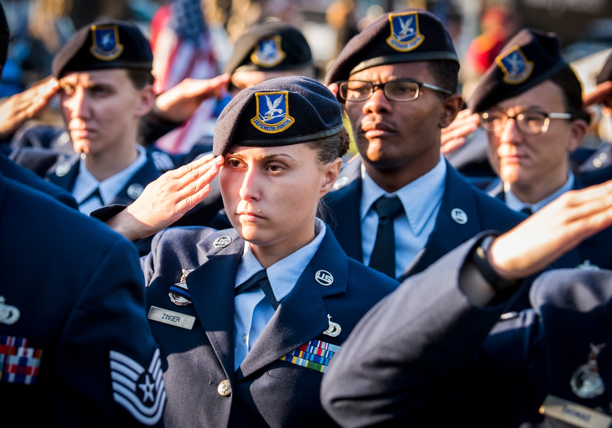 Airman 1st Class Danielle Napoli, 96th Security Forces Squadron, and a formation of Air Force Security Forces Airmen salutes at the Peace Officers’ Memorial Ceremony May 11 in Fort Walton Beach, Fla. The ceremony was to honor fallen police officers from the previous year by reading their names aloud. Security forces Airmen from Eglin and Hurlburt Field attended and participated in the event. The ceremony is one of many events taking place during National Police Week. (U.S. Air Force photo/Samuel King Jr.)