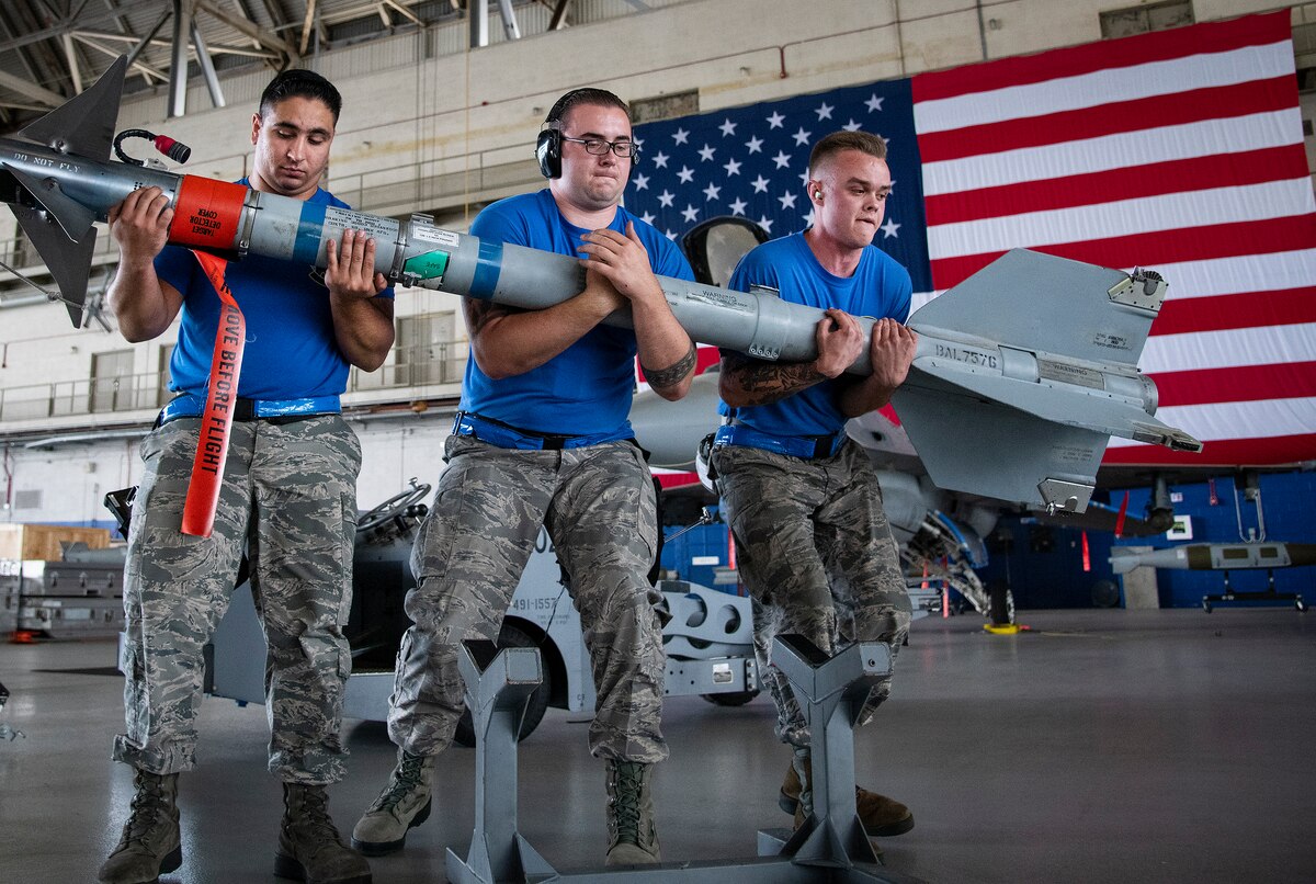 Senior Airman Nicholas LaBerge, 96th Aircraft Maintenance Squadron Red, secures an AIM-9X missile at the 96th Test Wing’s first quarter weapons load competition April 20 at Eglin Air Force Base, Fla. The F-16 Blue Team defeated the F-15 Eagle Red Team in a competition to load an AIM-9X and an Mk-82 the fastest and with the fewest mistakes. (U.S. Air Force photo/Samuel King Jr.)