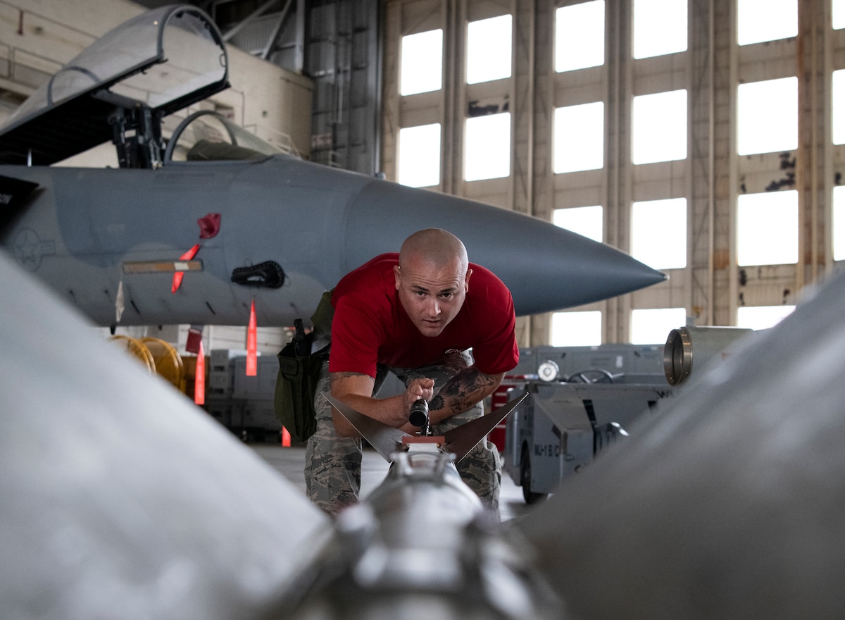 Staff Sgt. Kyle Palmer, 96th Aircraft Maintenance Squadron Red, performs a check on an AIM-9x missile during the 96th Test Wing’s third quarter weapons load competition Oct. 21 at Eglin Air Force Base, Fla. The F-16 Blue Team defeated the F-15 Eagle Red Team in a competition to load an AIM-9 and a GBU-12 the fastest and with the fewest mistakes. (U.S. Air Force photo/Samuel King Jr.)