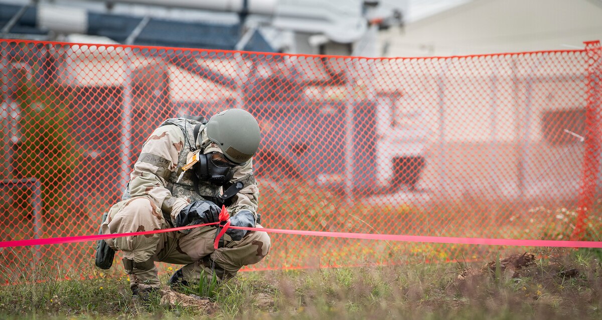 Airman 1st Class Adrienne Pelino, 96th Comptroller Squadron, decontaminates her suit at a transition point during a chemical, biological, radiological, nuclear and explosive exercise at Eglin Air Force Base, Fla., Nov. 7. The Air Force Materiel Command evaluation exercised the Airmen’s ability to meet wartime and contingency taskings of employing and sustaining the force and the ability to survive and operate. (U.S. Air Force photo/Samuel King Jr.)