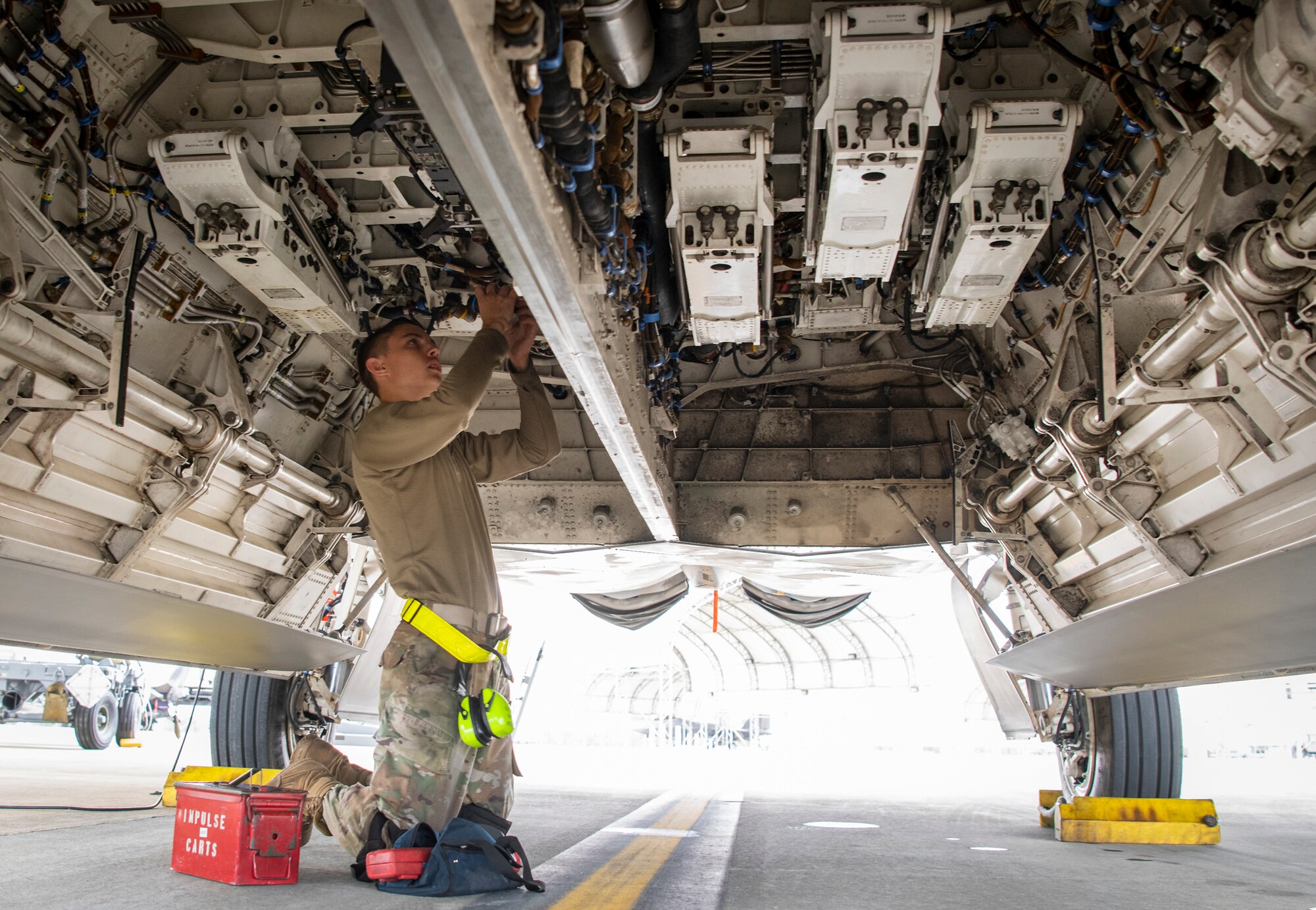 Staff Sgt. Dylan Lyons, 325th Aircraft Maintenance Squadron, guides a GBU-32 onto an F-22 Raptor during the unit’s weapons load competition Oct. 6 at Eglin Air Force Base, Fla. Two weapons load crews competed to see who could load an AIM-9 and a GBU-32 onto their aircraft the fastest and with the fewest errors. The winner will be announced at the unit’s 3rd quarter awards ceremony. (U.S. Air Force photo/Samuel King Jr.)