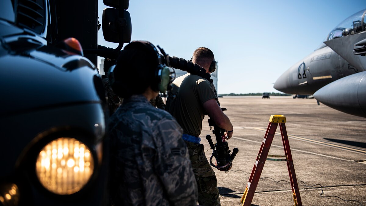 Senior Airman Aaron Irvin, 19th Airlift Wing photojournalist, documents the loading of personnel and cargo on a C-130J Super Hercules from the 61st Airlift Squadron during Agile Flag 21-1 at Eglin Air Force Base, Florida, Oct. 26. Multiple Public Affairs Airmen documented Agile Flag 21-1 to ensure the Airmen, U.S. citizens and interested parties across the world understand how the Air Force is changing to become more adaptable, survivable, and combat-ready for combatant commanders in the future. (U.S. Air Force photo by Senior Airman Andrew Kobialka)
