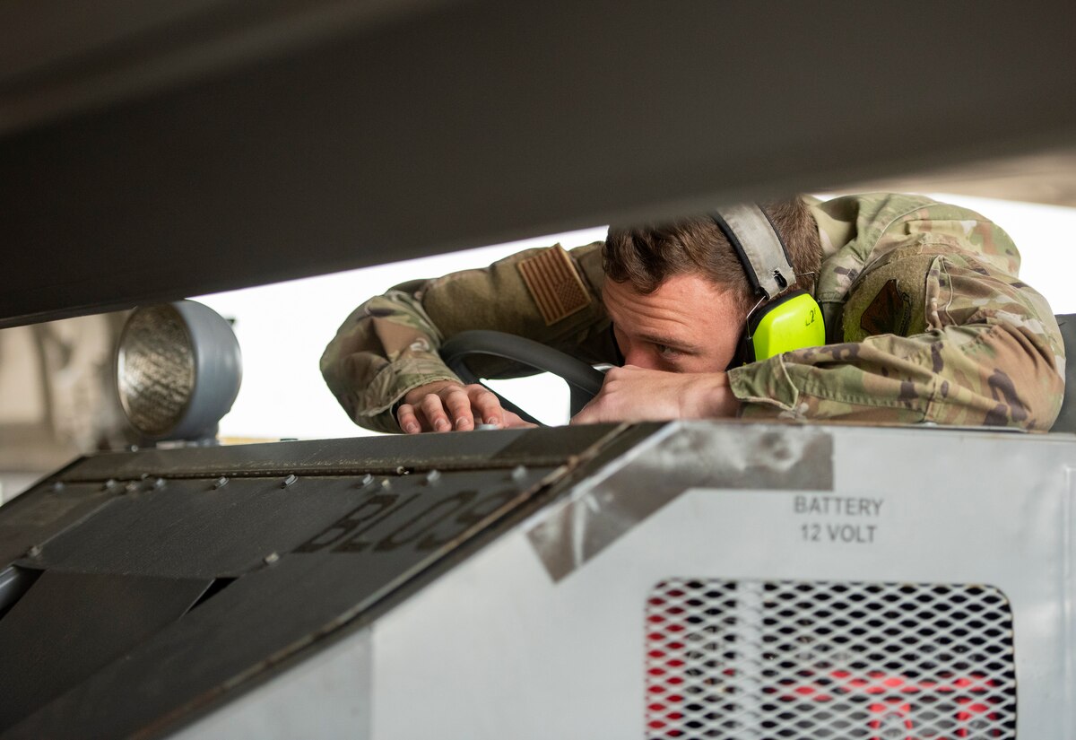 Tech Sgt. Dustin Stewart, 325th Aircraft Maintenance Squadron, secures a Joint Direct Attack Munition for loading onto an F-22 Raptor during the unit’s weapons load competition March 23 at Eglin Air Force Base, Fla. The two teams of three weapons load crew members competed to see who could load a GBU-32 and an AIM-9 on their aircraft quickly with the fewest errors. The winning team will be announced in April. (U.S. Air Force photo/Ilka Cole)