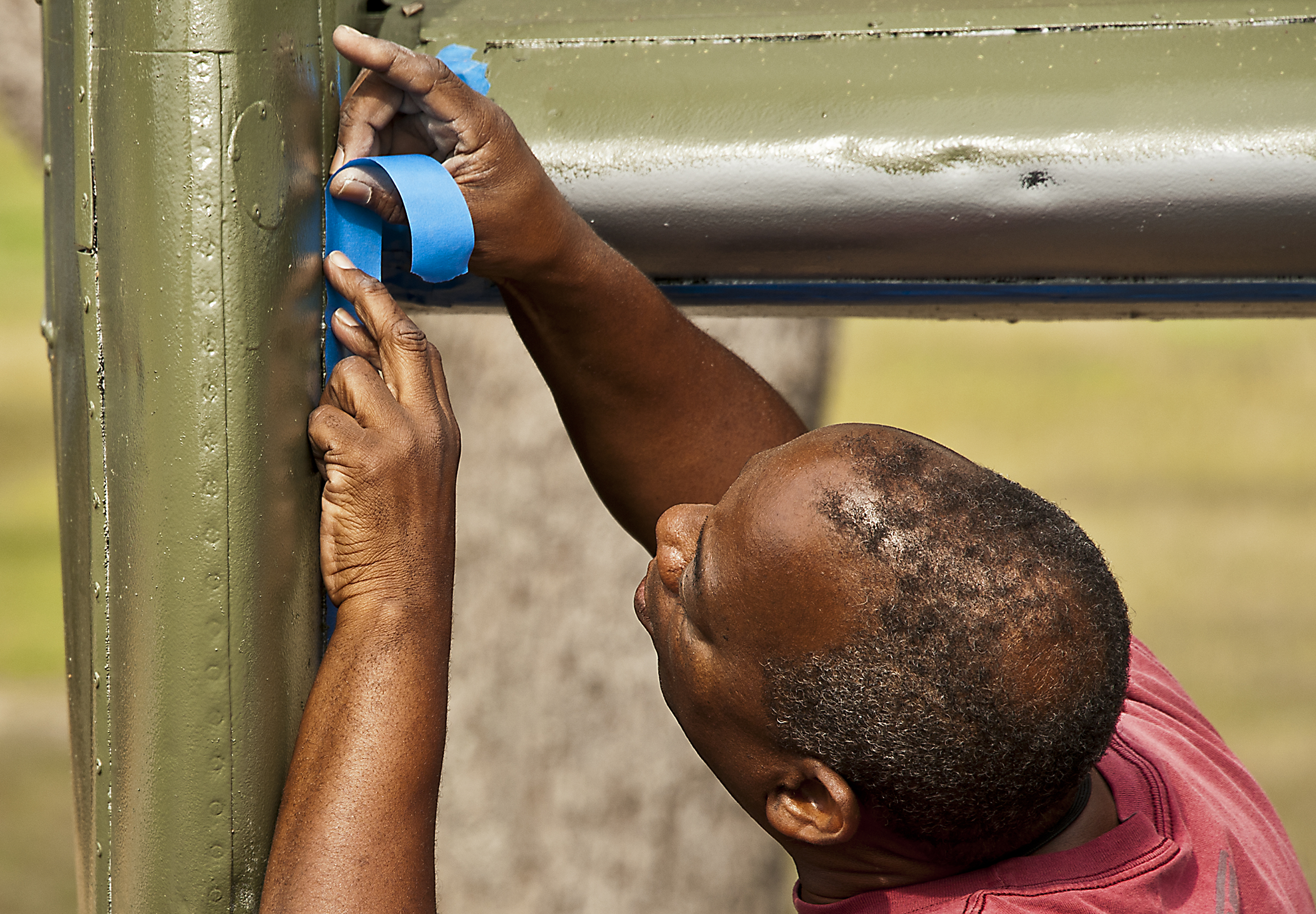 Airman 1st Class Anthony Colon-Matos, of the 96th Logistics Readiness Squadron, removes the painters tape off of the B-25 aircraft display at the Air Force Armament Museum, April 5. Colon-Matos and other members of LRS’s petroleum, oil and lubricants flight restored the B-25 as part of Eglin’s Adopt-a-Plane program. LRS adopted the B-25 six years ago. This is the second time the squadron’s Airmen have painted it. (U.S. Air Force photo/Samuel King Jr.)