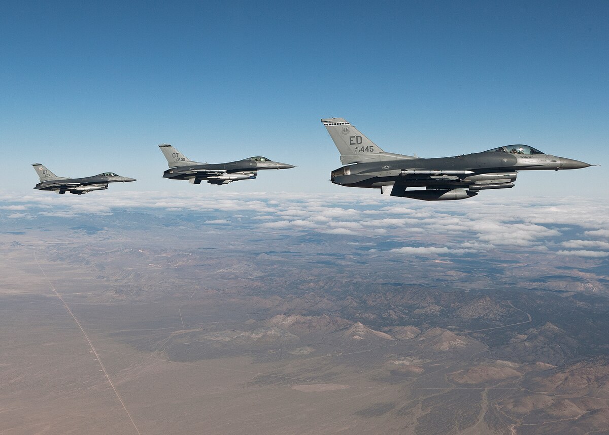 Pilots from the 416th Flight Test Squadron and 422nd Test and Evaluation Squadron fly a formation flight back to Nellis Air Force Base, Nev., after completing their Red Flag 12-2 exercise mission Feb. 3. The 422nd TES is stationed at Nellis AFB and is a geographically separated unit of the 53rd Wing. The 416th FLTS is from Edwards AFB, Calif. (Courtesy photo/Chad Bellay)