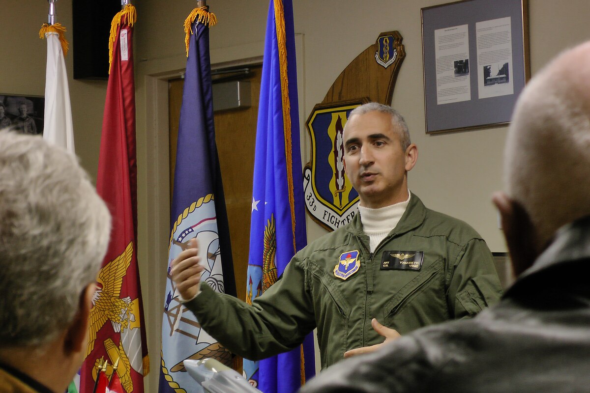 Marine Col. Art Tomessetti, 33rd Fighter Wing vice commander, explains how his team is preparing to train future pilots and maintainer of the F-35 to Okaloosa County commissioners during their tour here Dec. 14. (Courtesy photo by Kathy Newby)