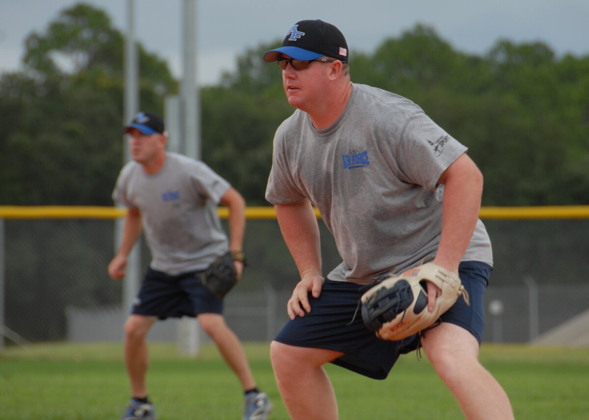 The Air Force Men’s Softball Team held tryouts and practices at Eglin Air Force Base, Fla., during the last three weeks in preparation for the All Services Tournament in Pensacola Fla., beginning Sept. 20. Fifteen Air Force members from 11 different bases made the team this year. Four ‘rookies’ made the team this year along with 11 team veterans. (U.S. Air Force photo/Samuel King Jr.)
