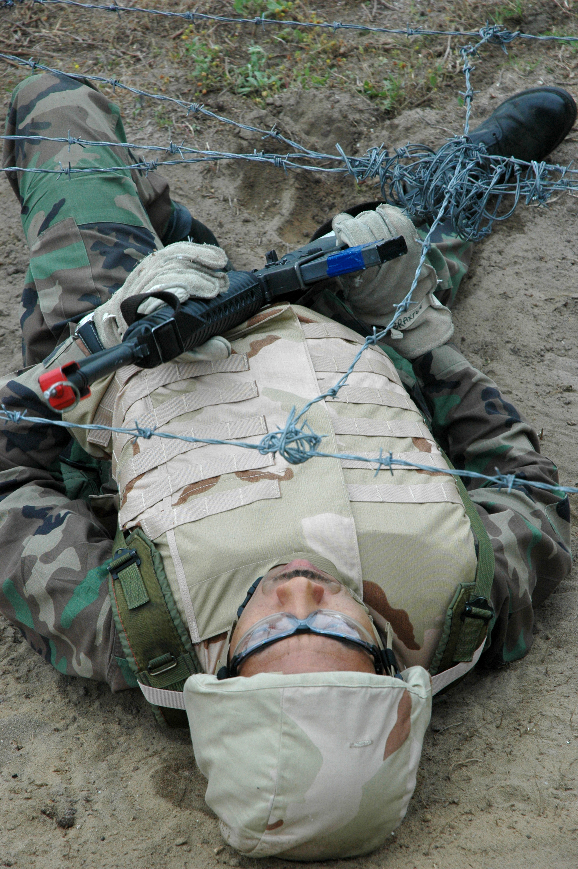 EGLIN AIR FORCE BASE, Fla. - Staff Sgt. Robert Poole, 96th Surgical Operations Squadron, confers with a "battle buddy" while tackling a simulated battlefield during Expeditionary Combat Skills training April 18. The exercise culminated three days of combat skills training. (U.S. Air Force photo by Staff Sgt. LuCelia Ball)