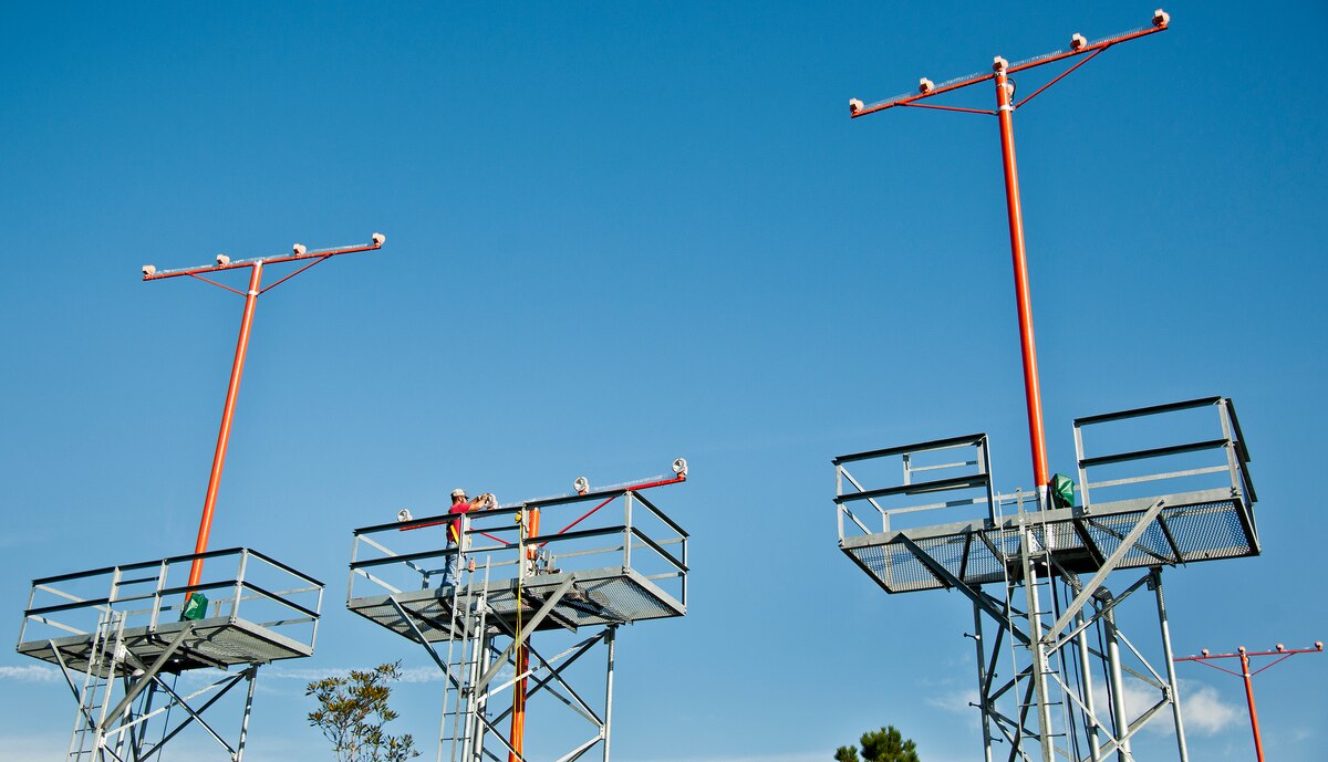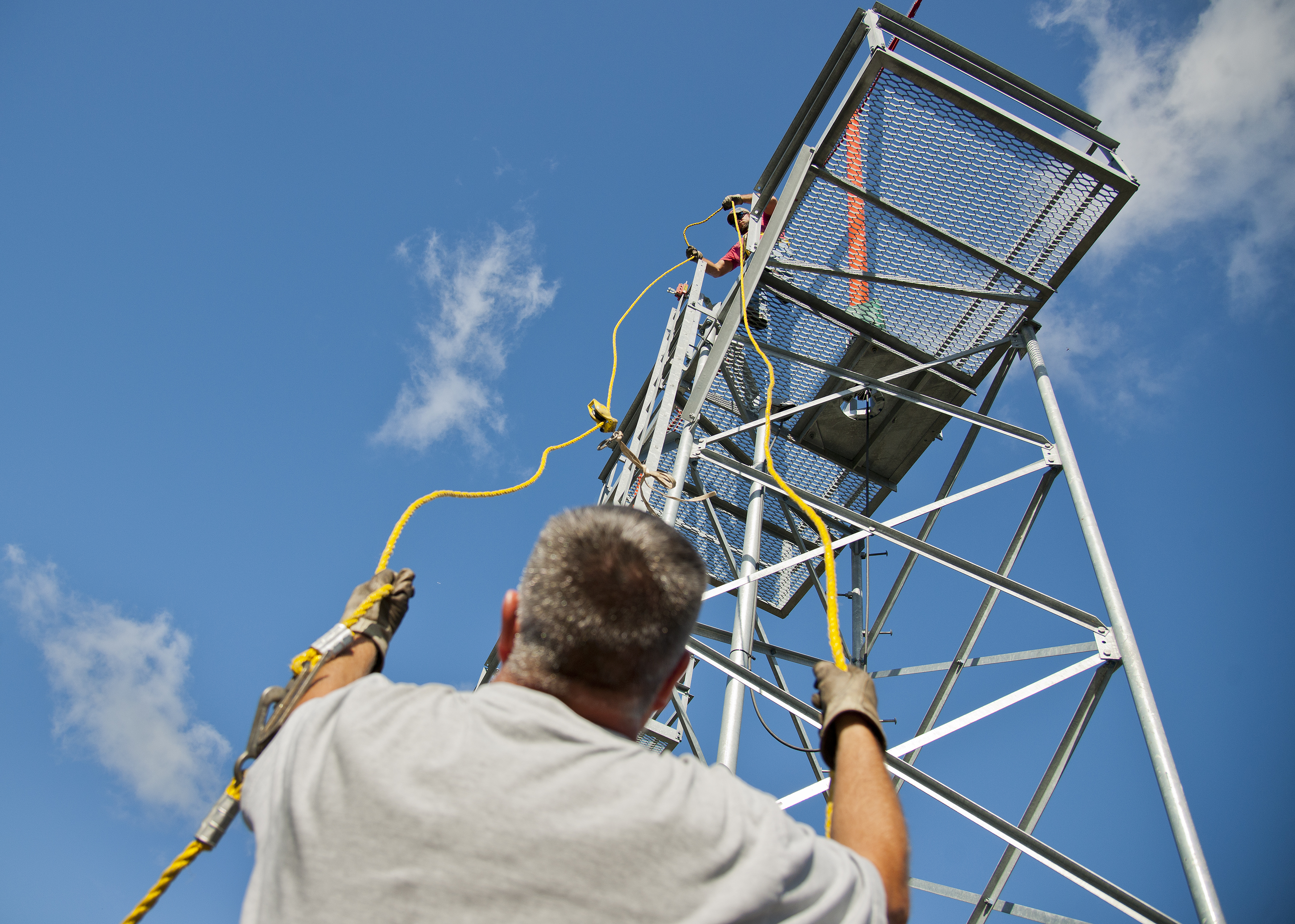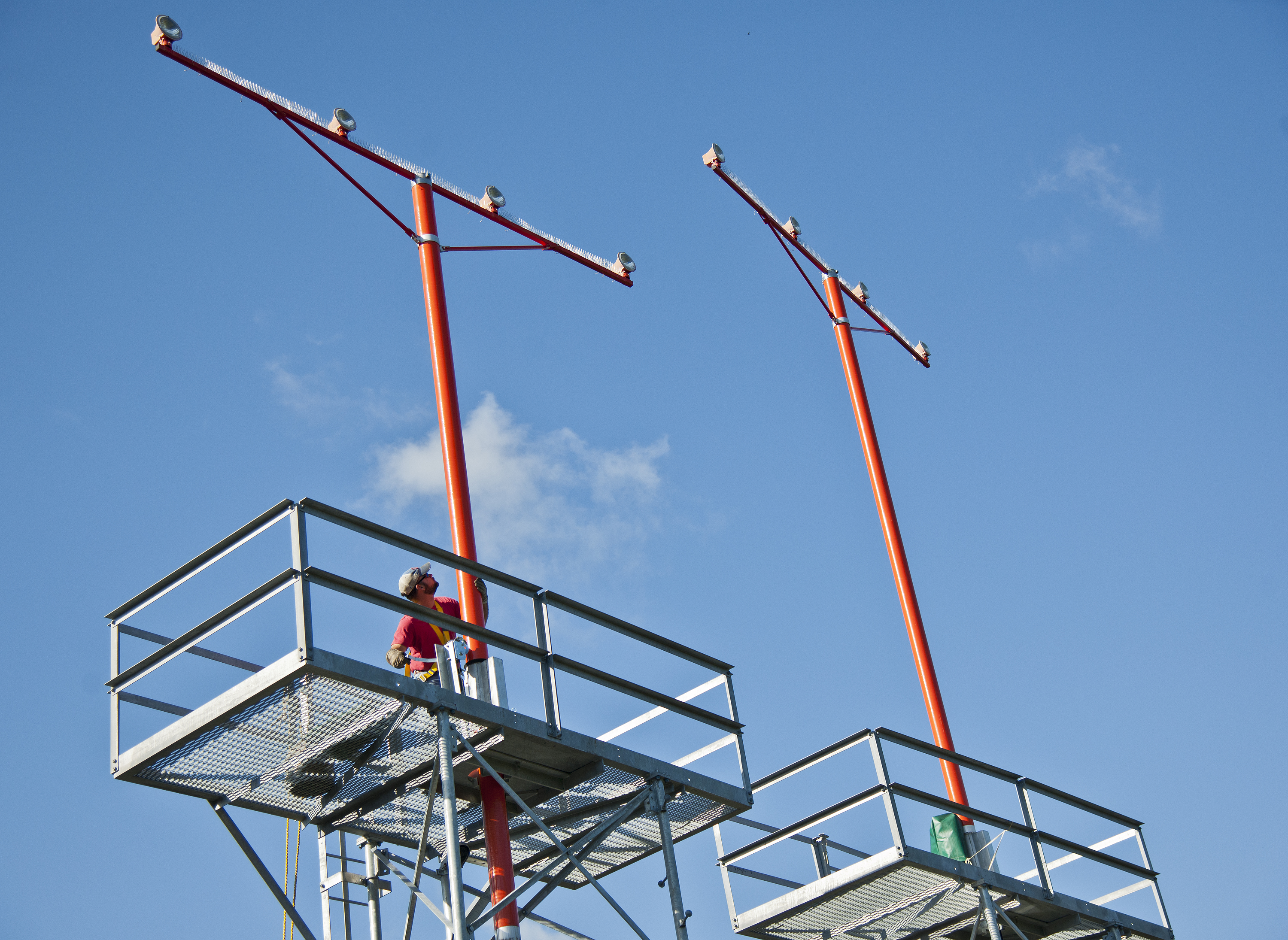 Dusty Dees, 796th Civil Engineer Squadron, prepares a new bulb prior to connecting it to the airfield approach lighting system tower Oct. 29 at Eglin Air Force Base, Fla. These elevated systems at Eglin and Duke Field are maintained by the 796th CES. Eglin and Duke’s systems contain 60 elevated towers. Each contains four 200-watt lamps. Civil Engineer personnel change out approximately 60 of the 240 lamps used at the top of the spires every year. (U.S. Air Force photo/Samuel King Jr.)
