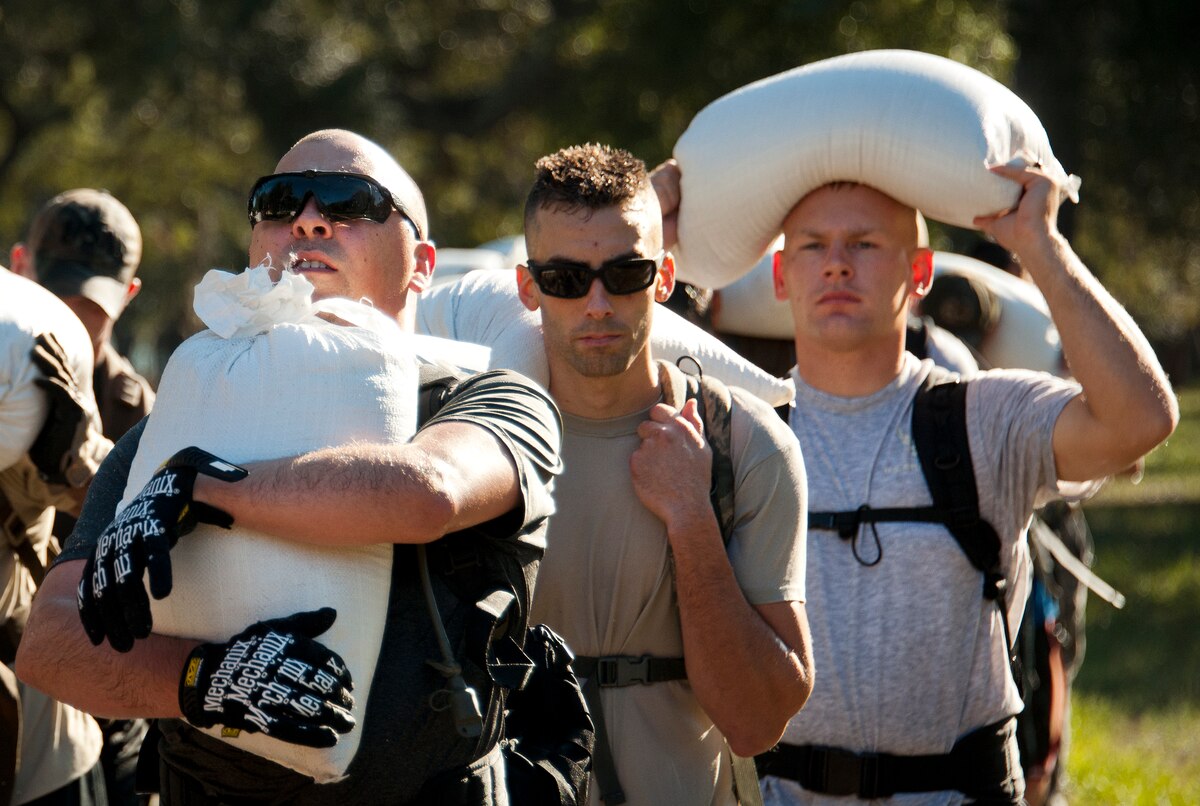 Airman Ryan Parker carries his wingman, Airman James Boglivi, 366th Training Squadron Det. 3, on his back during the GoRuck team building challenge Sept. 24 at Eglin Air Force Base, Fla. More than 45 participants pushed themselves through the physical scenarios led by a Special Forces veteran, to earn the blue and black “GoRuck” patch. (U.S. Air Force photo/Samuel King Jr.)