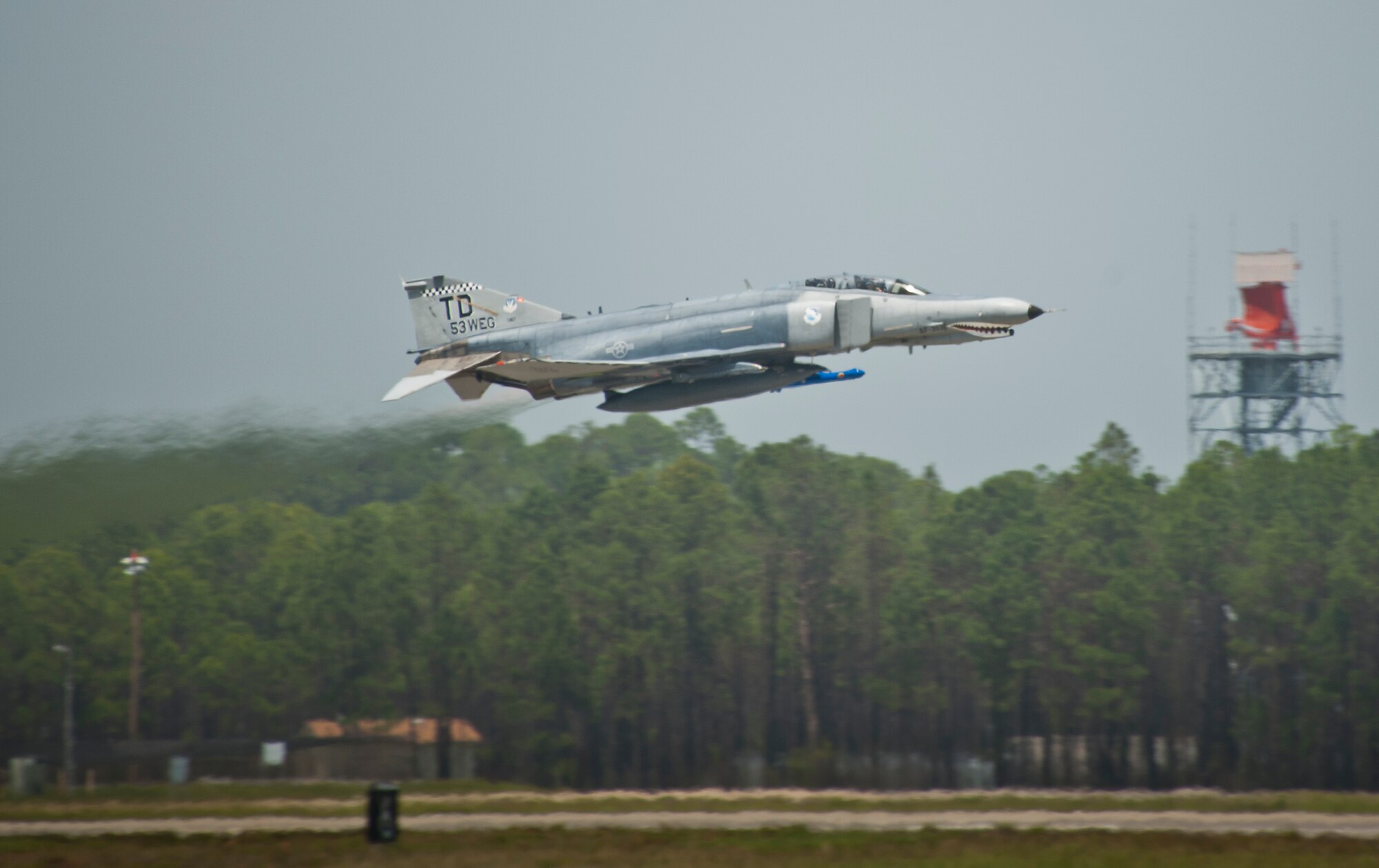 Lt. Col. Ryan Inman, 82nd Aerial Targets Squadron commander, takes off from the runway in a QF-16 May 12 at Tyndall Air Force Base, Fla. The QF-16 is a Full Scale Aerial Target that has been modified to be flown with a pilot in the cockpit for training and also without a pilot as a target for live missile testing. The 82nd ATRS received their first QF-16 in September of 2014 and will continue to transition their full scale aerial target program to the new model over the next several months. The 82nd ATRS operates QF-4, QF-16 and BQM-167 targets to provide manned and unmanned aerial targets support for programs across the Department of Defense. (U.S. Air Force photo/Sara Vidoni)