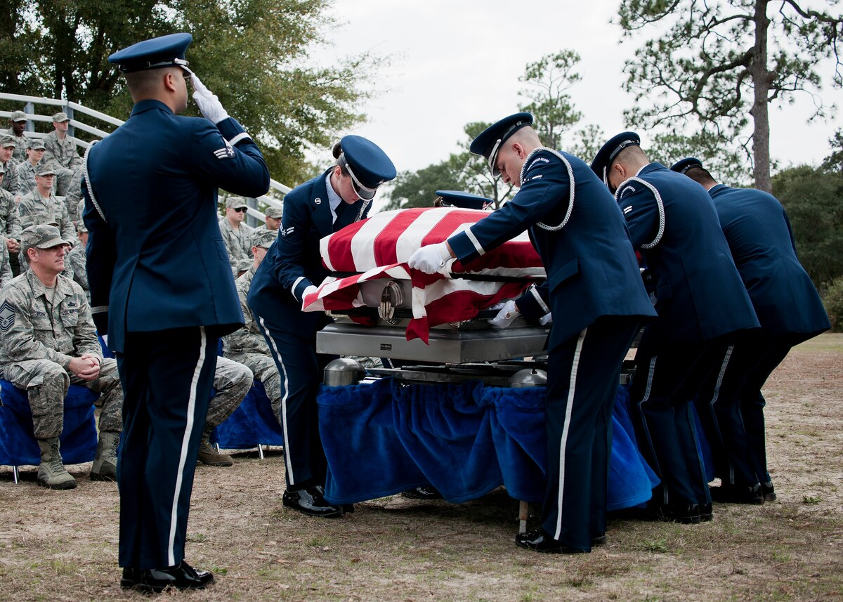 Senior Airman Jonathan Rivera-Flores, 33rd Maintenance Group, presents the flag to Col. Monte Cannon, 96th Test Wing vice commander, at the Honor Guard graduation ceremony March 4 at Eglin Air Force Base, Fla. Approximately 12 new Airmen graduated from the 80-plus-hour course. The graduation performance includes flag detail, rifle volley, pall bearers and bugler for friends, family and unit commanders. (U.S. Air Force photo/Samuel King Jr.)