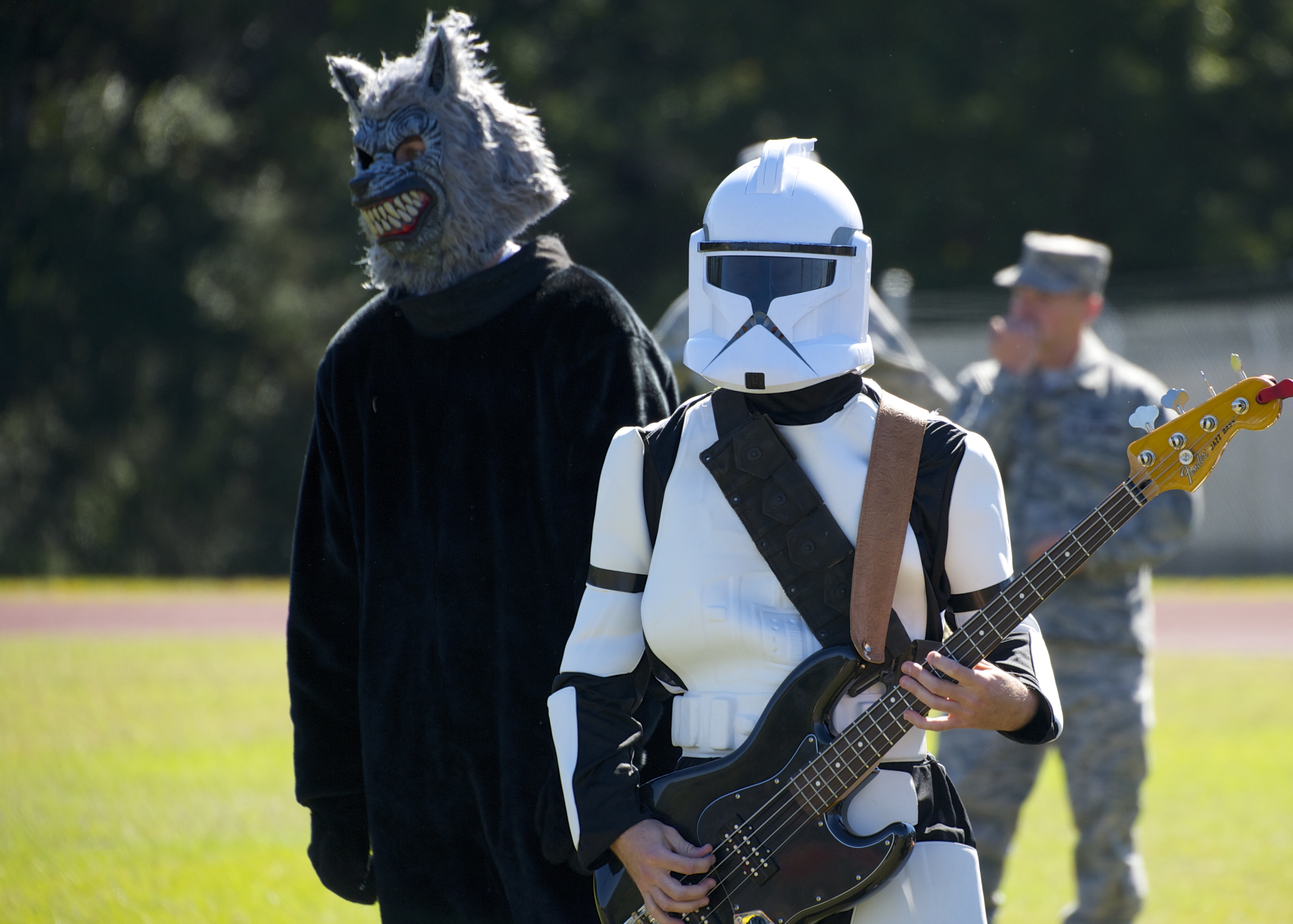 Tech. Sgt. Arisleyda Gonzalez, of the 96th Force Support Squadron, tries to escape three 96th Logistics Readiness Squadron defenders for more yardage during their powderpuff football game Oct. 31 at Eglin Air Force Base, Fla. LRS, the reigning champions, took home the win in a 13-0 victory by scoring a touchdown in each half and stopping FSS short in the red zone twice. The annual powderpuff game coincided with the 96th Test Wing’s Wingman Day which focused on strengthening relationships and showing respect and resiliency in the workplace. (U.S. Air Force photo/Sara Vidoni)
