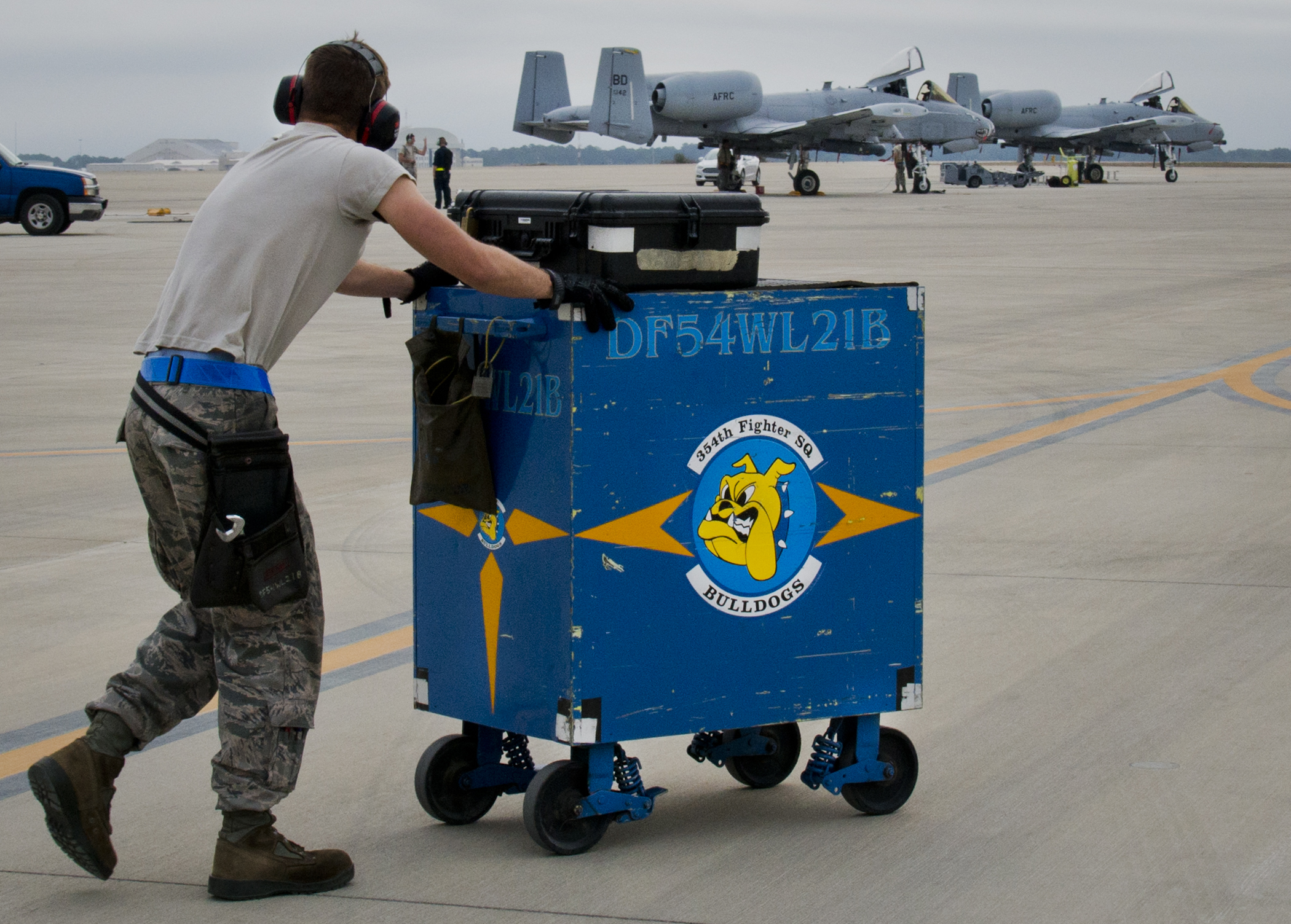 Airman Kevin Teto, of the 355th Aircraft Maintenance Squadron, watches an A-10 Thunderbolt II take off prior to launching his own aircraft for a sortie at Eglin Air Force Base, Fla., Feb. 19. The A-10s from Davis-Monthan Air Force Base, Ariz., participated in the week-long Weapon System Evaluation Program known as Combat Hammer, in which they released air-to-ground munitions. The Combat Hammer WSEP program is managed by the 86th Fighter Weapons Squadron, part of the 53rd Wing. (U.S. Air Force photo/Samuel King Jr.)