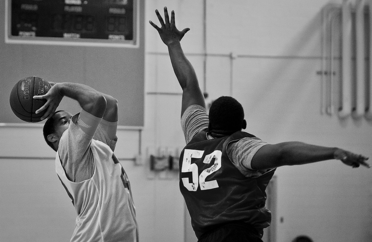 A player jumps toward the basket as a defender tries to block during a 3-on-3 basketball tournament held Jan. 24 at the Eglin Air Force Base, Fla., gym. A total of six teams battled it out in 10-minute games in the double elimination tournament. (U.S. Air Force photo/Samuel King Jr.)