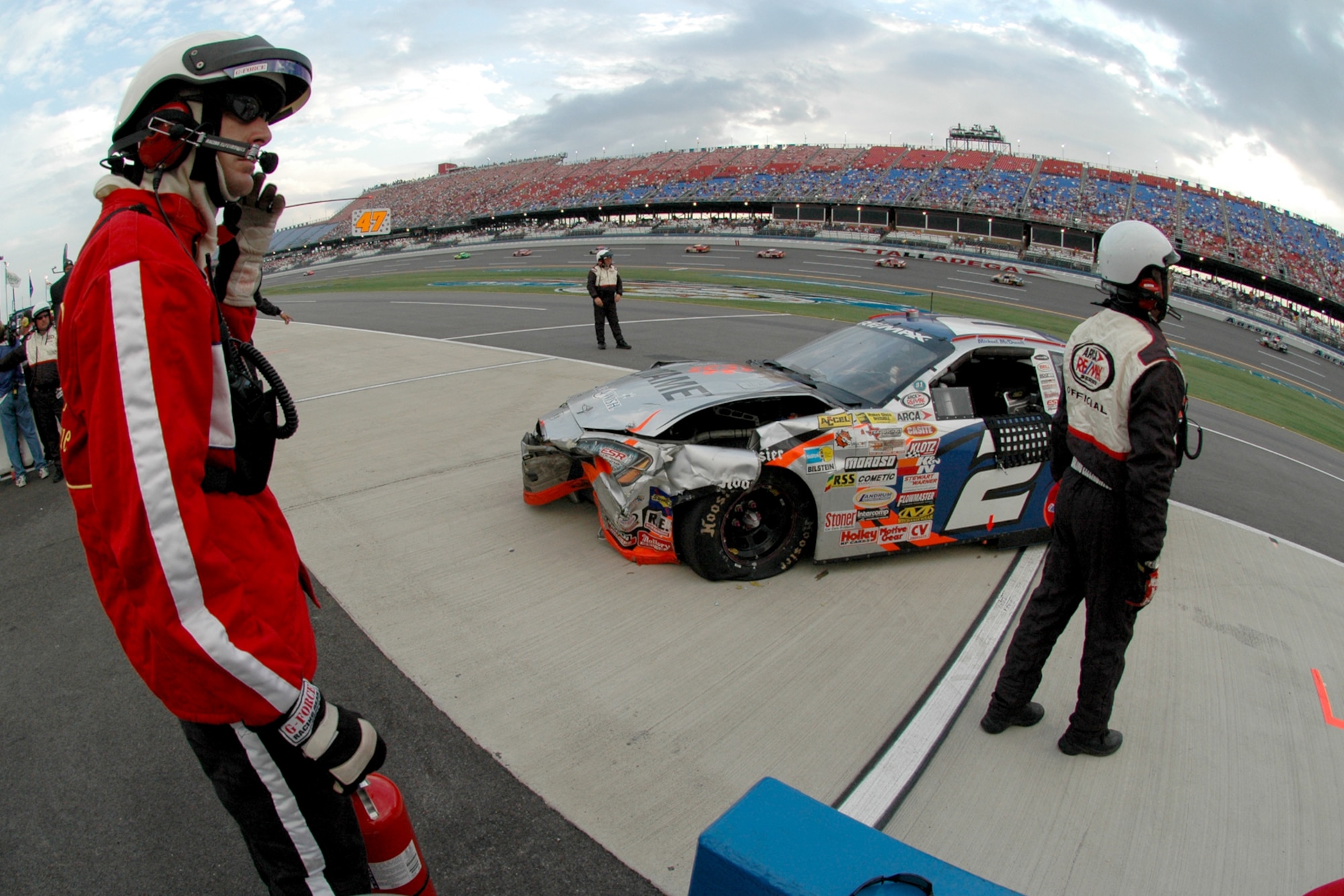 TALLADEGA, Ala. -- Tech. Sgt. Jimmy Reed, Eglin Air Force Base, Fla., firefighter and Air Force reservist at Keesler AFB, Miss., stands watch in the pits over the No. 42 Automobile Racing Club of America RE/MAX Series race Oct. 5. John Piccuito, J.R. Suddarth and Sergeant Reed, Eglin Air Force Base firefighters, are among a group of firefighters from all over the country that go to the spring and fall Talladega NASCAR races to make sure the drivers and race teams are safe. They provided safety for the Friday night Automobile Racing Club of America RE/MAX Series race, the NASCAR Craftsman Truck Series race on Saturday and the NASCAR Nextel Cup Series race on Sunday. (U.S. Air Force photo by Staff Sgt. Mike Meares)