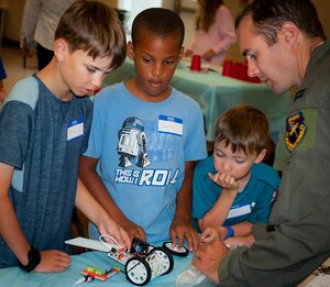 July 17, 2018 Young builders Capt. Weston Hanoka, 96th Test Wing, helps children use electronic building blocks to construct a miniature MARS Rover July 12 at Eglin Air Force Base, Fla.