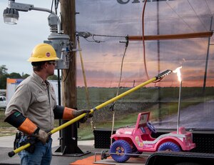 Oct. 28, 2019 A powerful demonstration Power linesmen highlight power line safety to base firefighters.