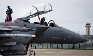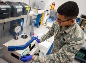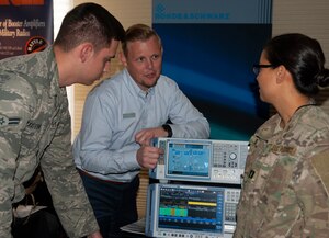 Frank Makal, Rohde & Schwartz account manager, demonstrates a vector signal generator, used for radar receiver testing, to Airman 1st Class Chase Rakestraw and Capt. Kayla Beach, 33rd Operations Support Squadron, at the Technology Expo at Eglin Air Force Base, Fla. Dec. 6.