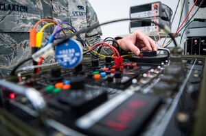 Frank Makal, Rohde & Schwartz account manager, demonstrates a vector signal generator, used for radar receiver testing, to Airman 1st Class Chase Rakestraw and Capt. Kayla Beach, 33rd Operations Support Squadron, at the Technology Expo at Eglin Air Force Base, Fla. Dec. 6.