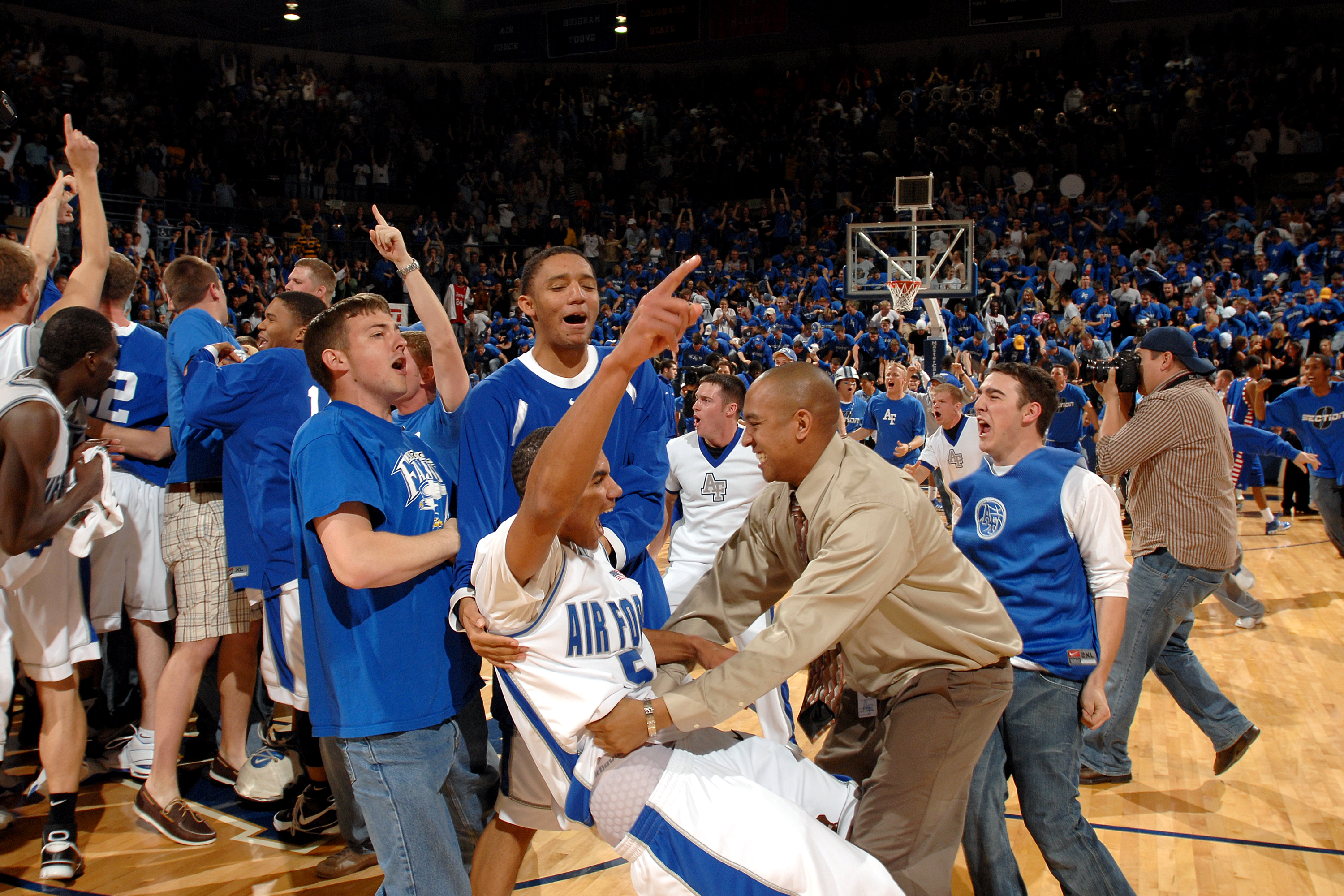 Falcon guard Matt McCraw, 5, fans and teammates celebrate Air Force's 52-51 win over DePaul March 21 at Clune Arena. The victory earned the bluesuiters a berth in the NIT semifinals in New York City's Madison Square Garden March 27 against Clemson. (U.S. Air Force photo/Danny Meyer)