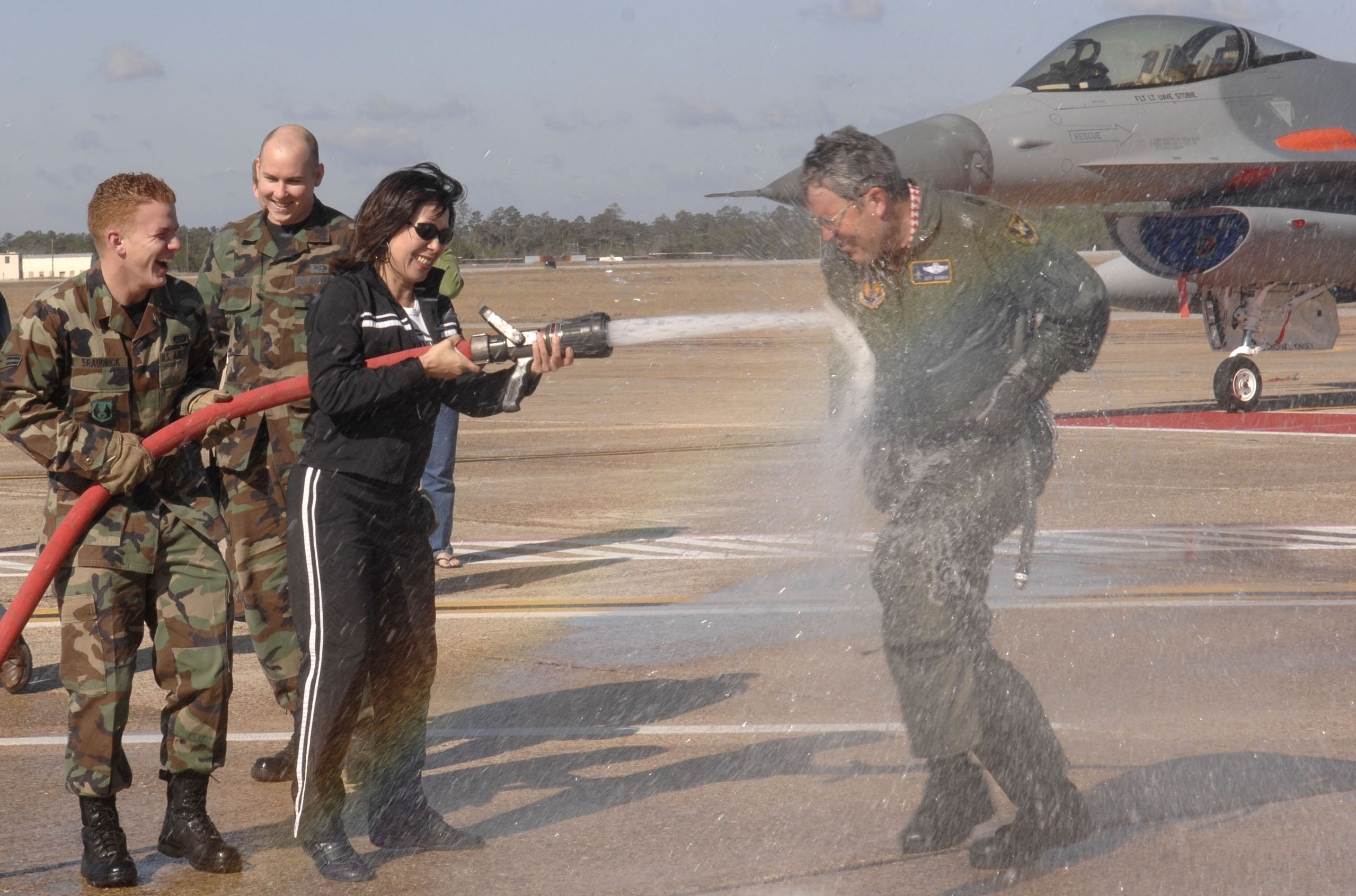 Maj. Gen. Jeffrey Riemer, program executive officer for weapons and Air Armament Center commander, gets hosed by his wife, Donna after his final flight at Eglin.