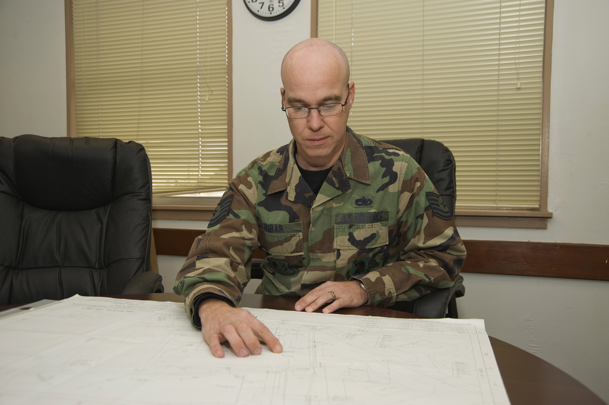 EGLIN AIR FORCE BASE, Fla. -- Tech. Sgt. Joseph Ribar, 96th Communications Group C-4 systems project manager, reviews base infrastructure maps. Sergeant Ribar recently received a promotion to technical sergeant under the Stripes for Exceptional Performers program. (U.S. Air Force photo by Greg Murry)