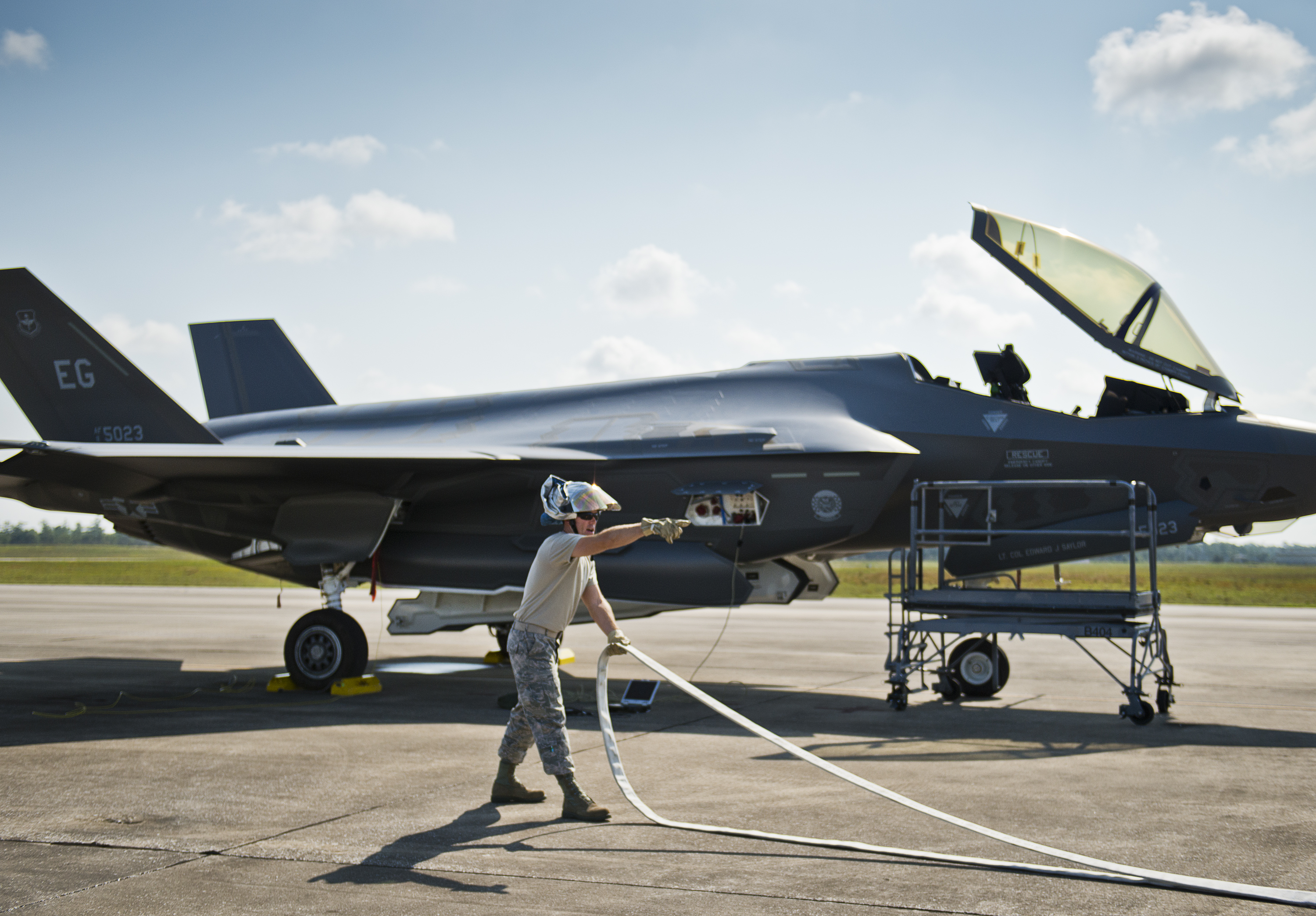 An Eglin Air Force Base firefighter begins to secure equipment after a joint-base major accident response exercise between Eglin Air Force Base and Duke Field, Fla., Aug. 6. The simulated accident was a mid-air collision of a 33rd Fighter Wing joint strike fighter and a 919th Special Operations Wing C-145. First responders had to react to both accidents simultaneously, secure the scene, put out fires and help the wounded. (U.S. Air Force photo/Tech. Sgt. Samuel King Jr.)