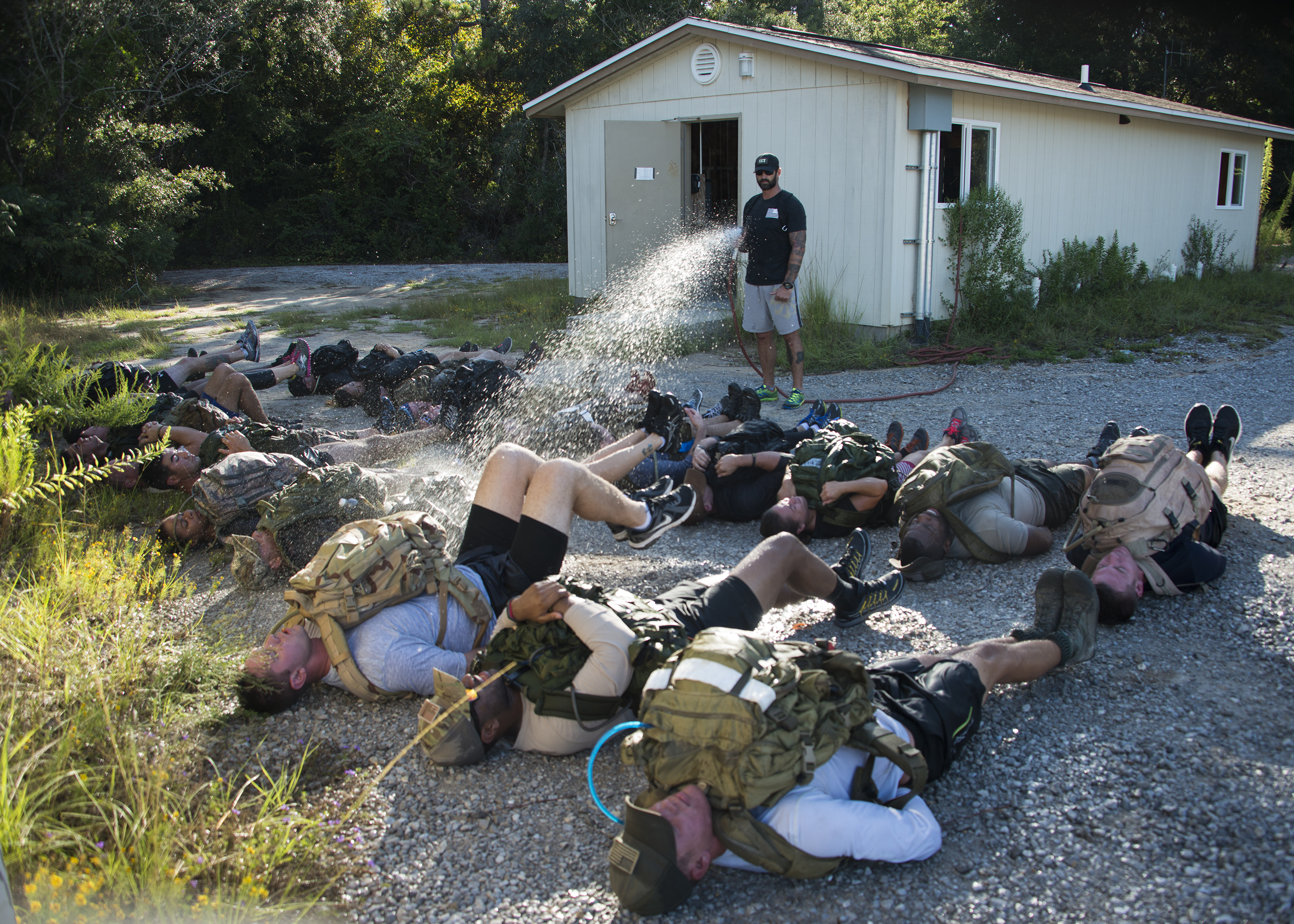 The instructor sprays the participants with a waterhose while they perform flutter kicks during the GORUCK Cohesion Challenge Sept. 11, at Eglin Air Force Base, Fla. This elite team-building event, led by a Special Forces veteran, featured military inspired challenges and missions. Only 24 out of the original 27 completed all obstacles. Eglin is the fifth base to complete the Team Cohesion Challenge, which is modeled after special operations training. (U.S. Air Force photo/Tech. Sgt. Jasmin Taylor)