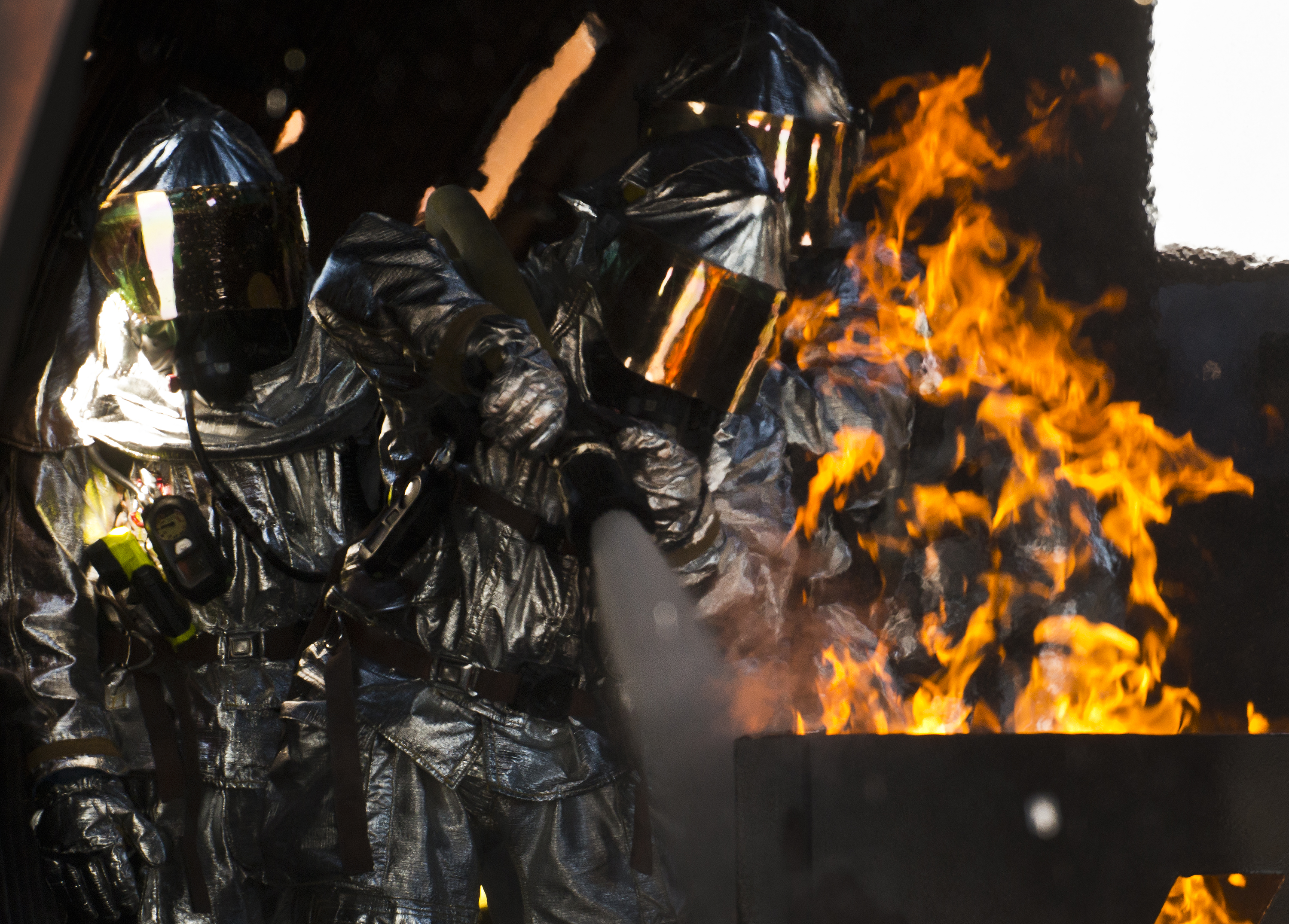 Firefighters from the 919th Special Operations Wing fire the hose at the fire during a training exercise at Eglin Air Force Base, Fla., Oct. 31. The reserve firefighters from Duke Field used Eglin’s aircraft fire pit to meet their annual training requirements. (U.S. Air Force photo/Tech. Sgt. Sam King)