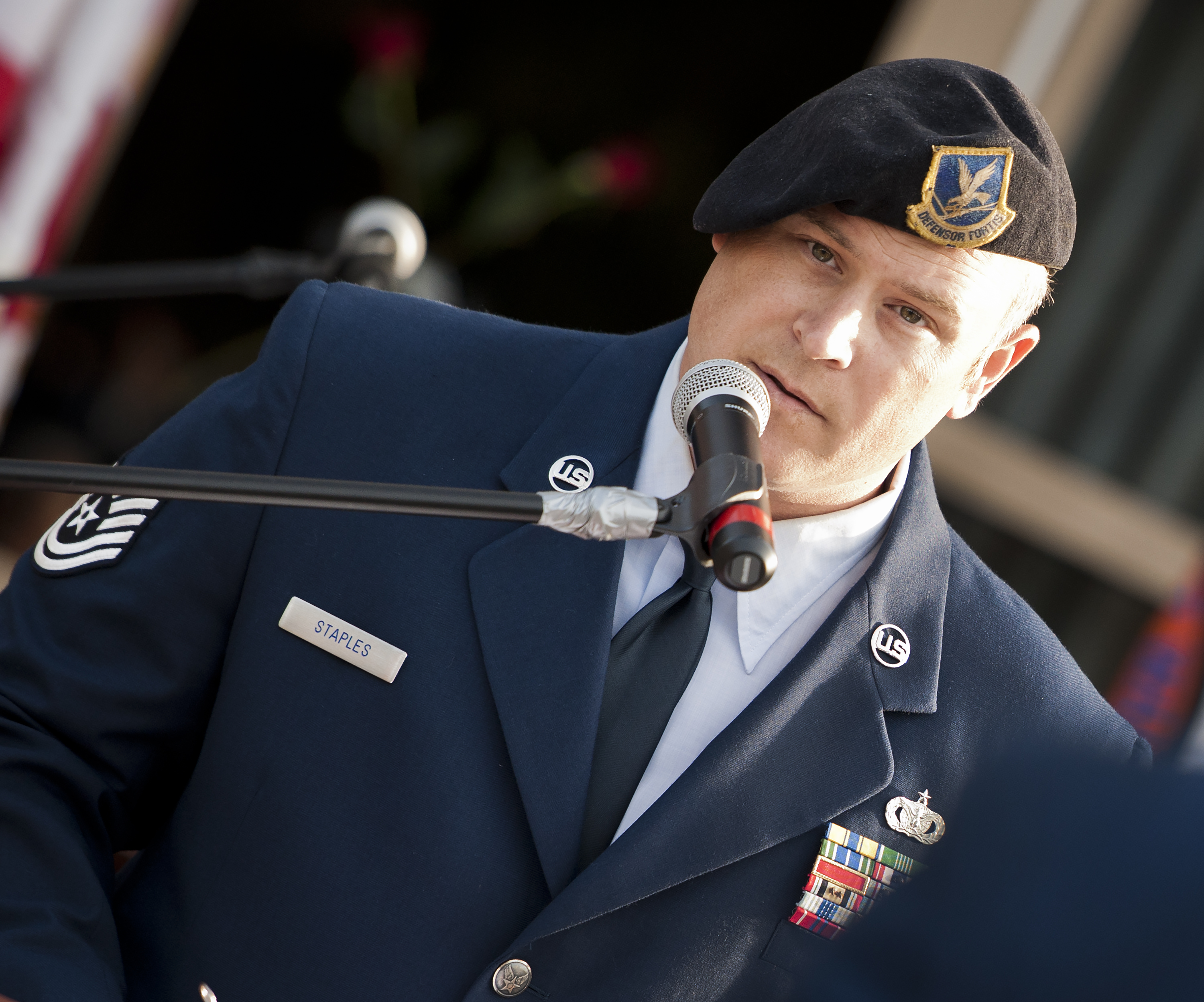 Tech. Sgt. Ryan Staples, 96th Security Forces Squadron, reads off names of fallen peace officers during a memorial ceremony May 16 in Fort Walton Beach, Fla. The Peace Officers’ Memorial Ceremony was to honor fallen police officers from the previous year by reading their names aloud. Security forces Airmen from Eglin and Hurlburt Field attended and participated in the event. The ceremony is one of many events taking place during National Police Week. (U.S. Air Force photo/Samuel King Jr.)