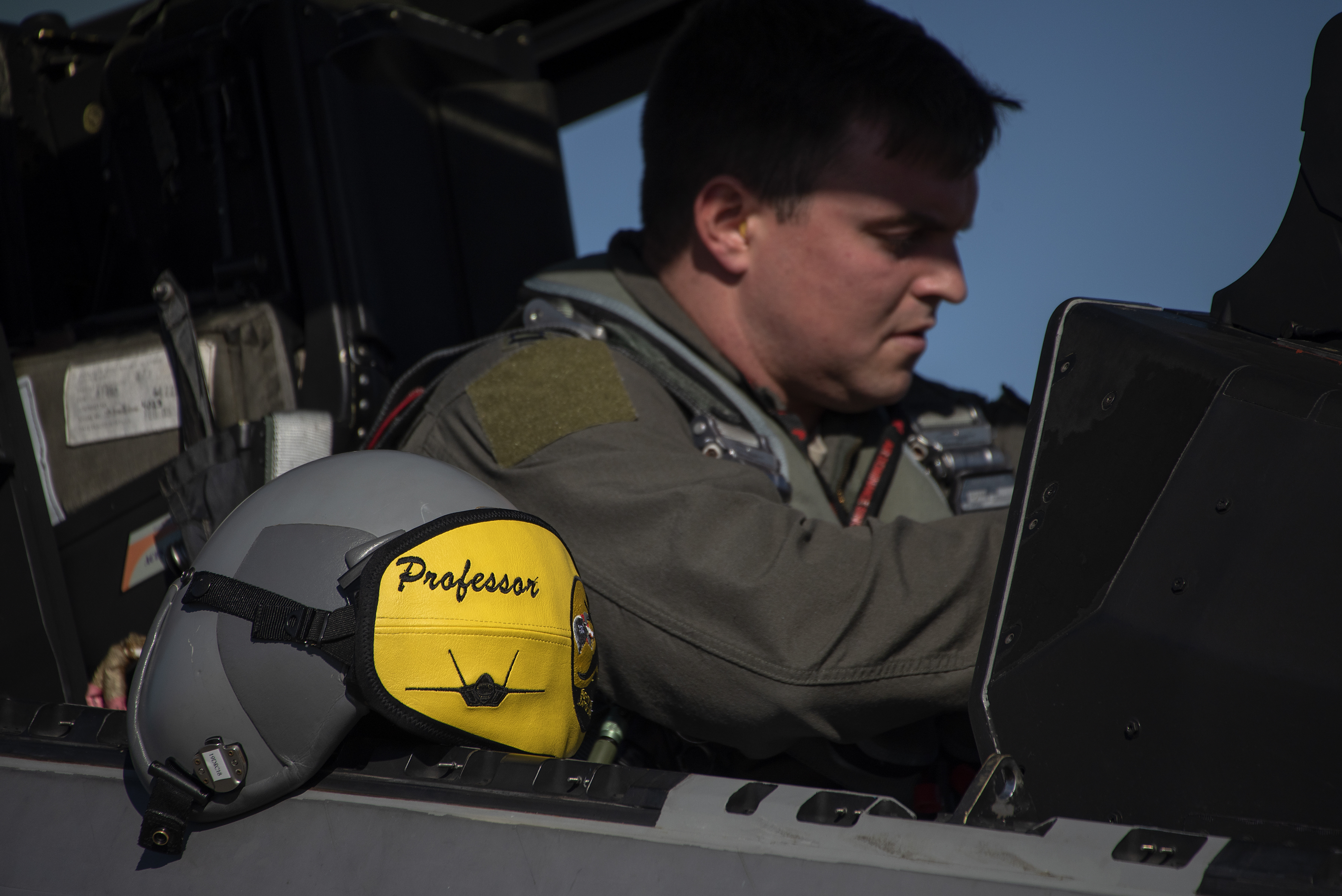U.S. Air Force Capt. Alexander "Professor" Gulick, 27th Fighter Squadron chief of standardization and evaluations, situates himself inside the cockpit of an F-22 Raptor Dec. 4, 2018, at Eglin Air Force Base, Florida. The 27th FS brought 200 personnel from Langley Air Force Base, Va., to participate in a Combat Archer exercise alongside the 33rd Fighter Wing. The exercise was flown out of Eglin due to the rebuilding efforts at Tyndall Air Force Base, Florida. (U.S. Air Force photo by Staff Sgt. Peter Thompson)